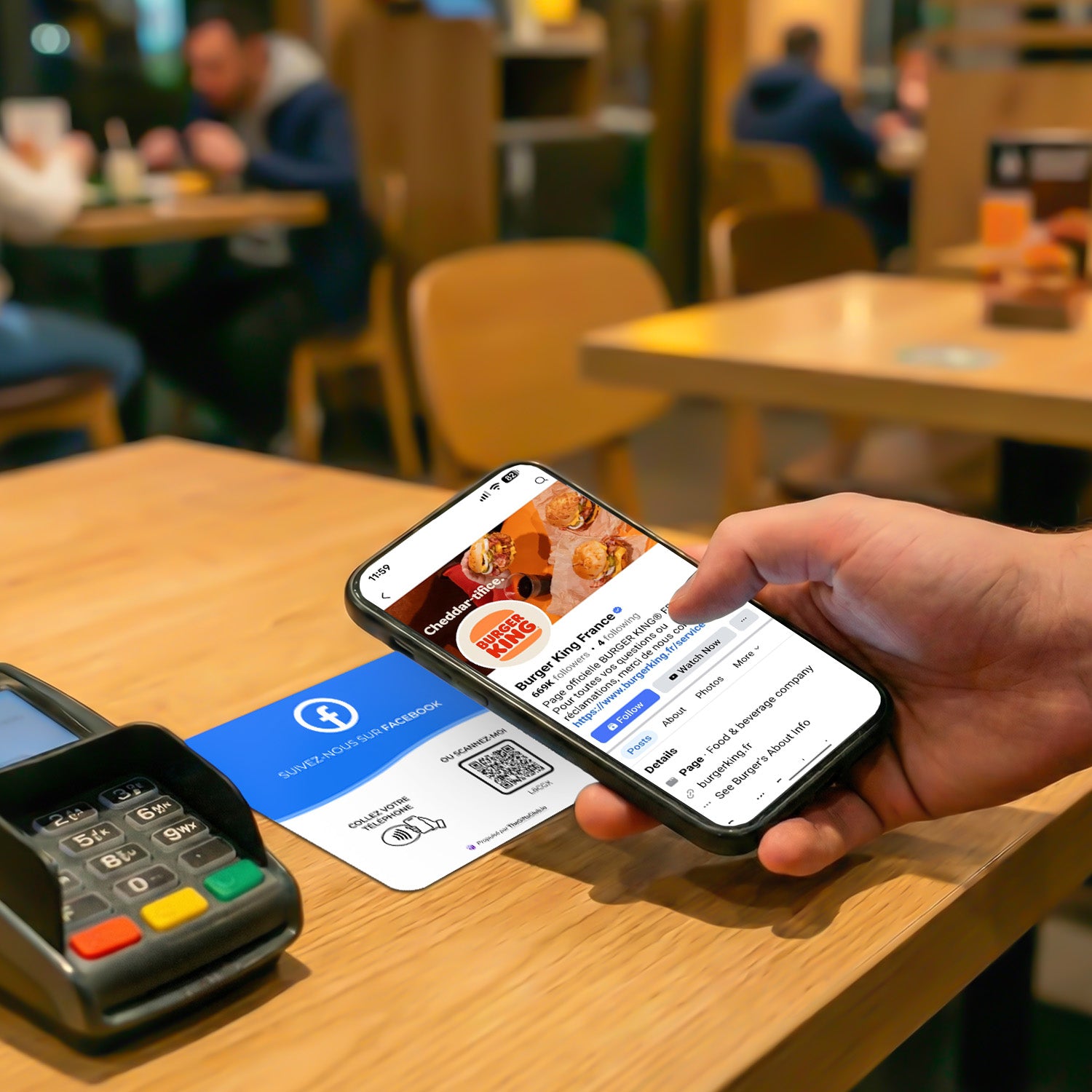 - Votre client approche son téléphone de la plaque ou scanne le QR code.